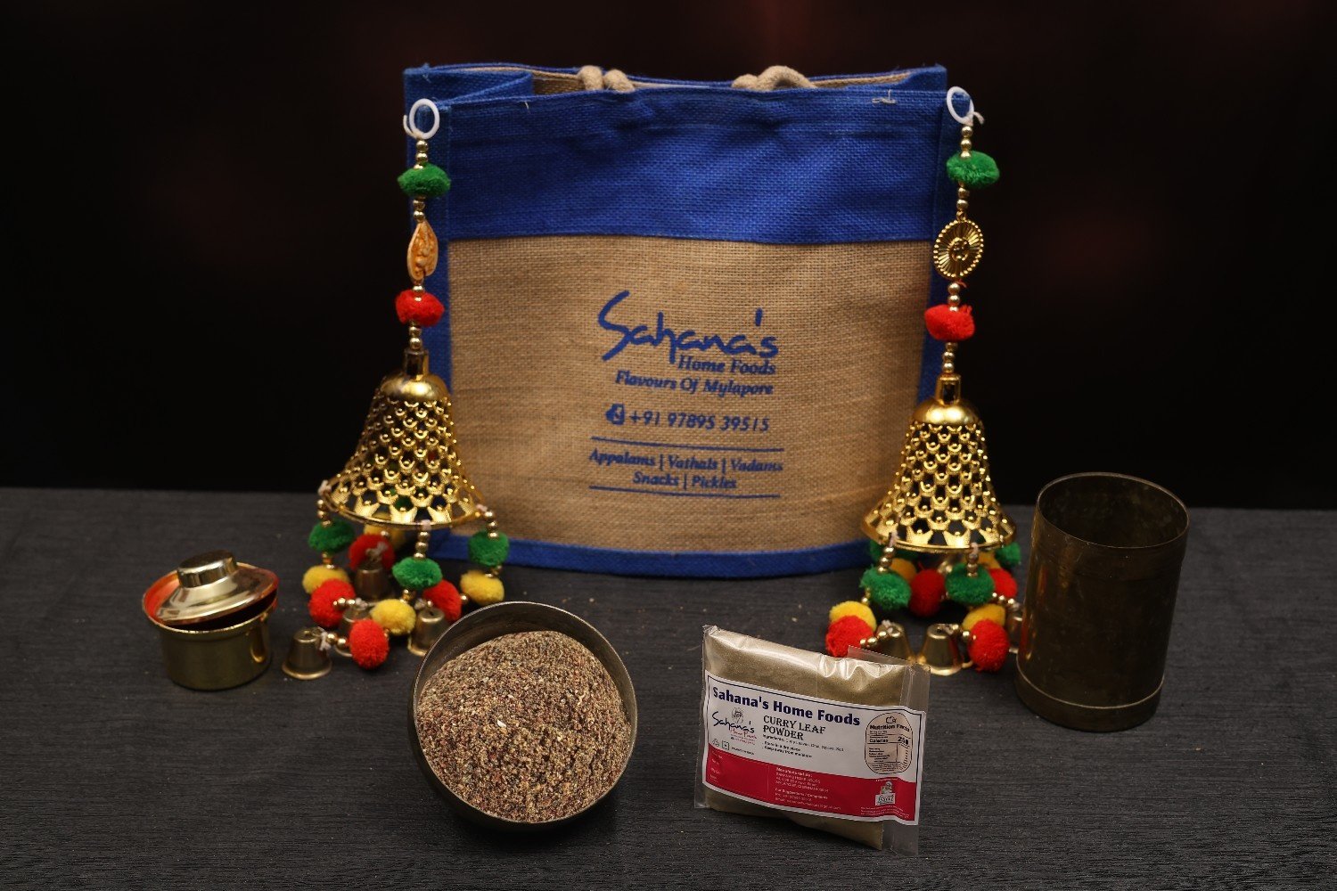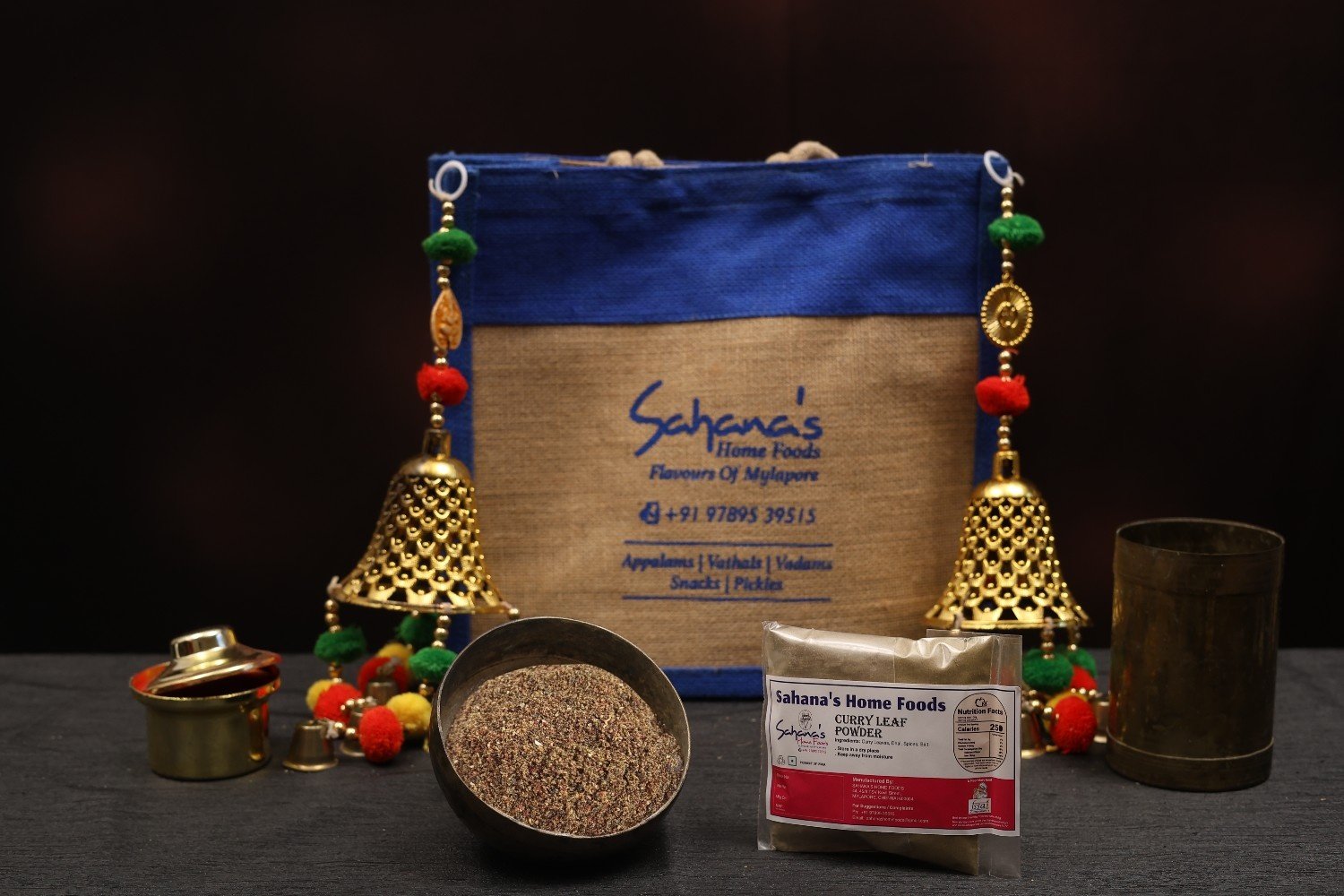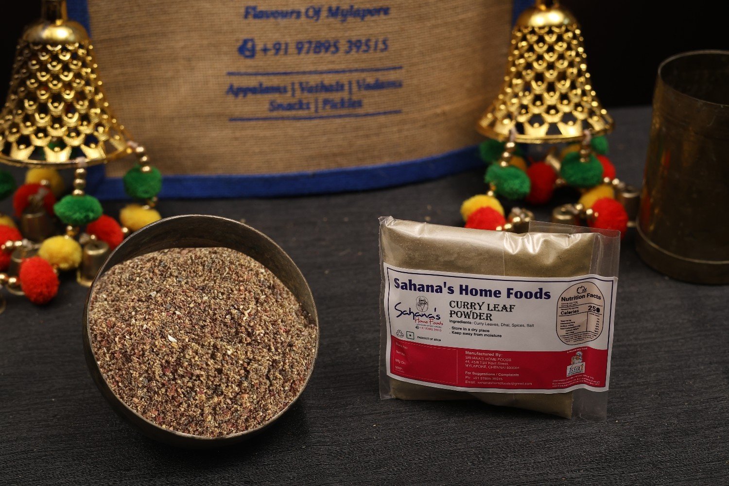 Aromatic and nutritious powder made from curry leaves, ideal for mixing with rice or using as seasoning.