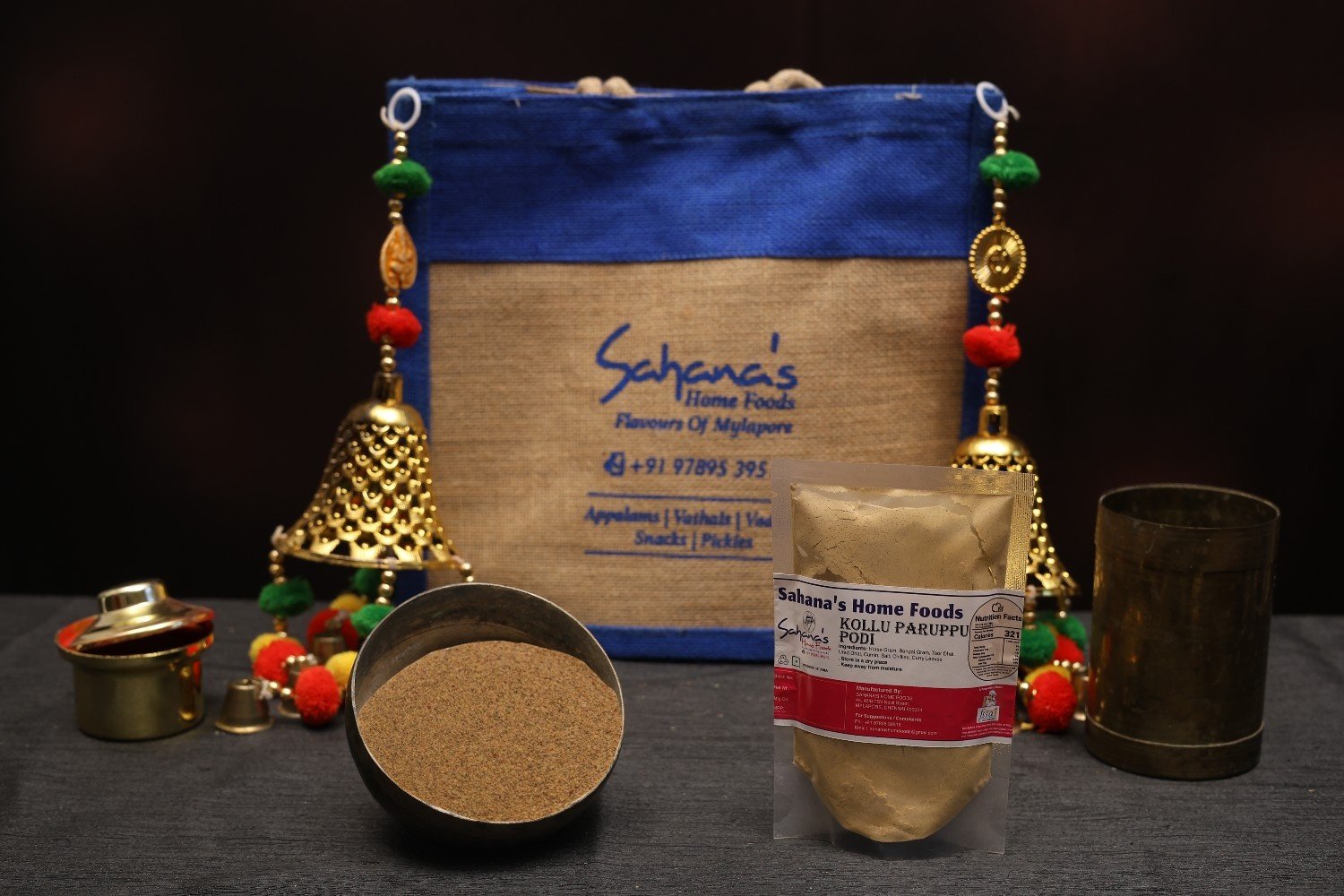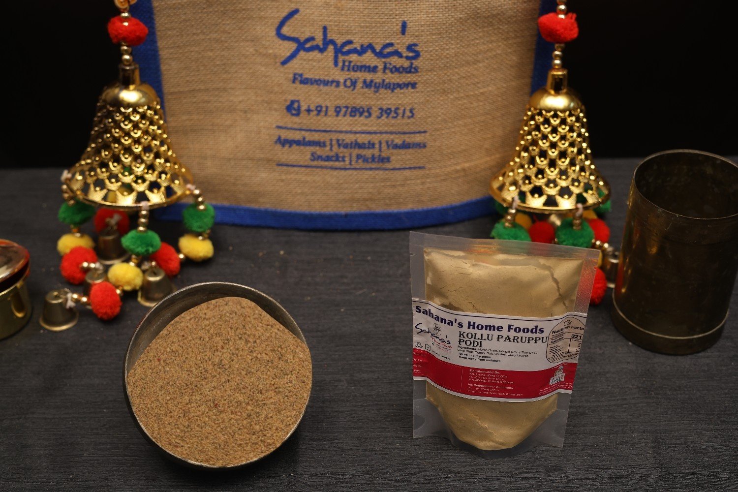 Protein-rich lentil powder made from horse gram, great for mixing with hot rice and ghee.