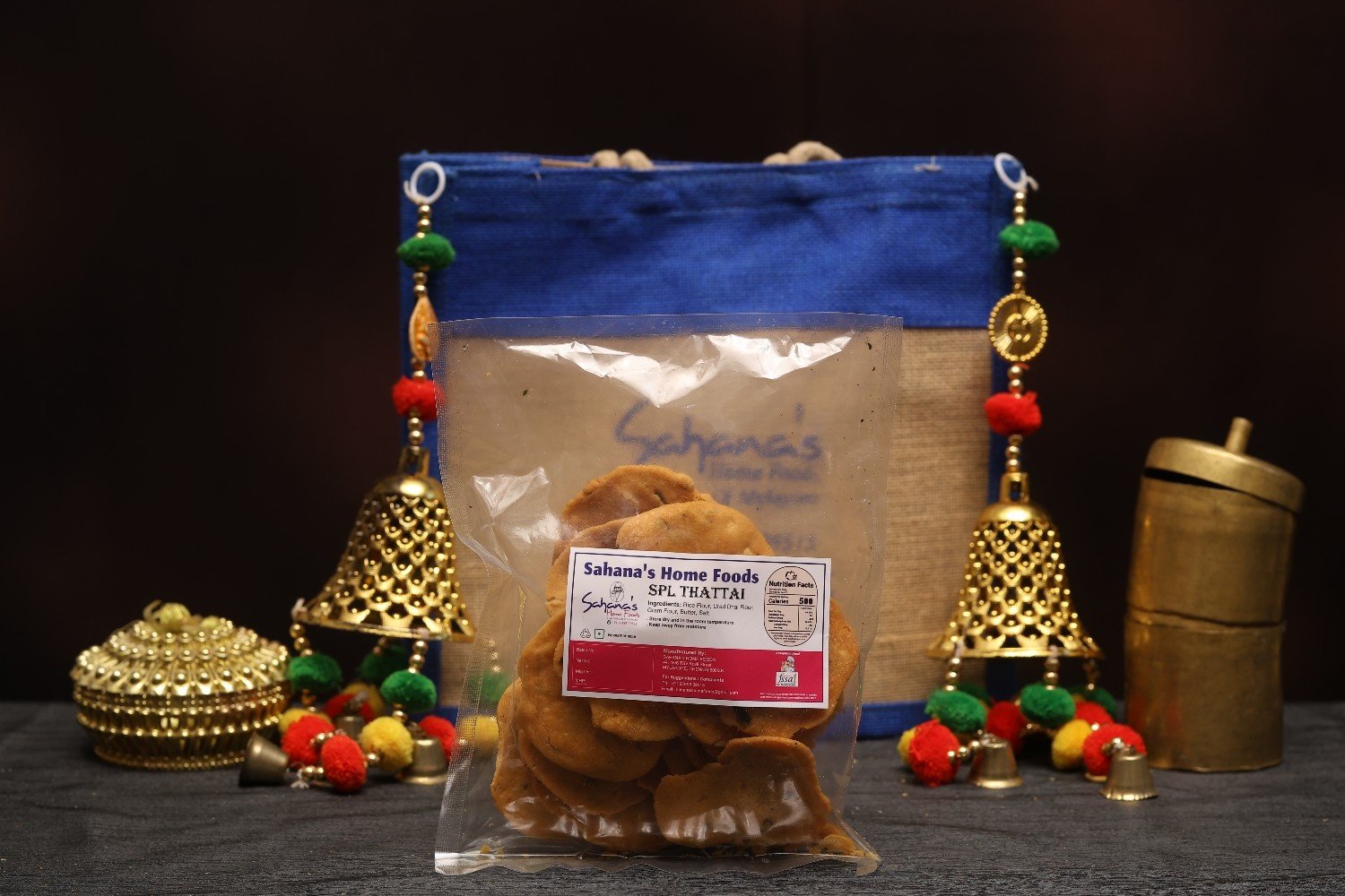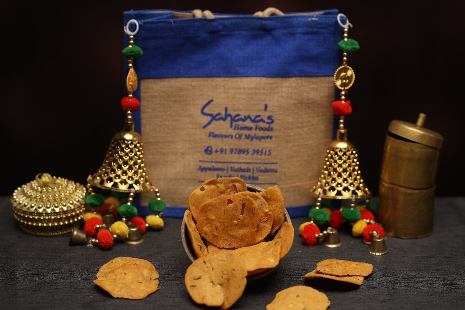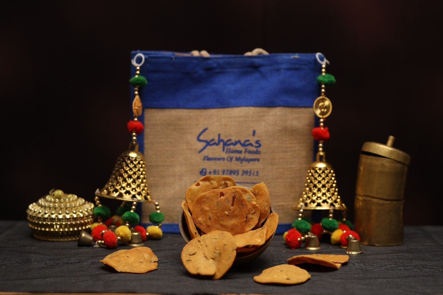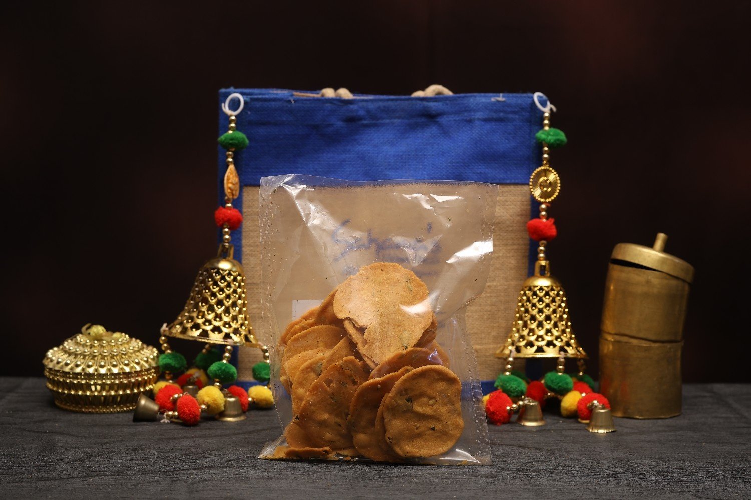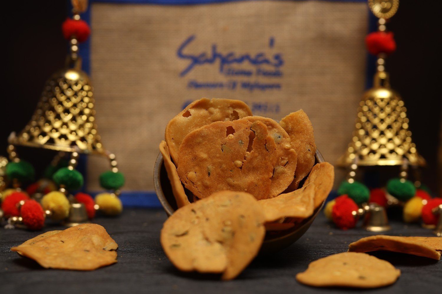 Crunchy, spicy rice crackers with lentils and curry leaves.